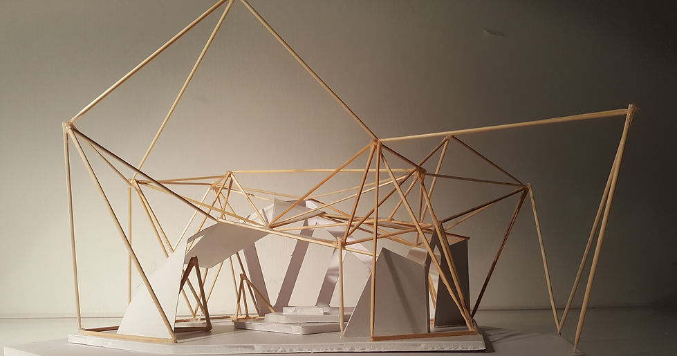 The final model is a built-up of the three models while applying the principles of design. Sticks were heavily used here to create interesting shadows while not covering up the third model's initial aesthetic looks. Pyramid shape structure and odd shaped platforms were added into the interior to create a unique interior visual flow and shadow when a light is shone on the model.
